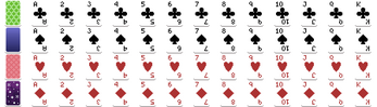 Complete set of 52 cards, not including jokers (at least as of yet). Designs are simple, and include 4 options to use for the back of the card. All assets I post will always be done without AI, this is hand pixeled in Aseprite.